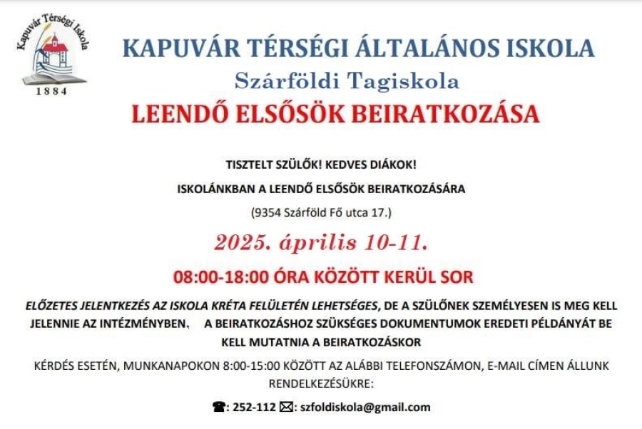 A mellékelt dokumentum szerint kerül sorá Szárföldön a leendő elsősök beiratkozására.